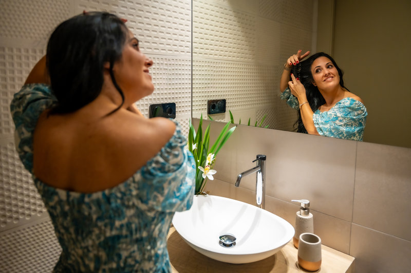 Woman facing the mirror and combing her hair alone in the bathroom at home